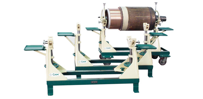 CAM offers more than a dozen stands for armature support and rotation during winding operations. They are robustly-constructed using steel weldments and cast iron support standards. Some stands have wheels for portability and others are designed for stationary support. Maximum weigh capacity ranges from 1000 lbs. (453.6 kg) up to 9,000 lbs. (4082.4 kg).