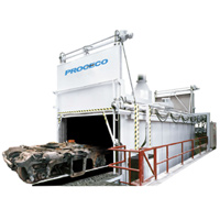 The monorail parts washer design saves floor space by hanging long parts from the conveyor vertically rather than conveying them horizontally.