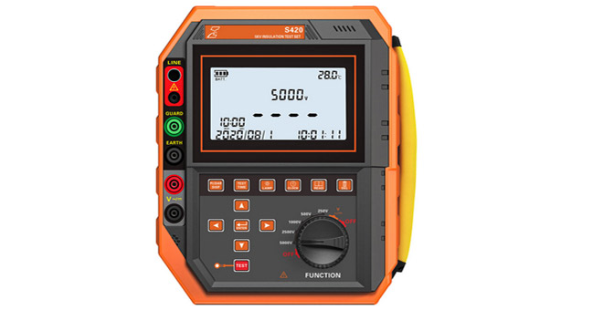 S420 Insulation Tester is a fully automatic 5kV insulation test set designed to provide a comprehensive assessment of the conditions of electrical insulations of high voltage apparatus such as the insulation resistance of transformers, bushing, circuit breakers, and other machinery. S420 makes measurement by using the ohm’s law with the 3 terminal method, which is much more accurate than the 2 terminal method. An additional Guard Terminal provides a return circuit that bypasses the meter, providing users a more precise result. The instrument is also able to automatically calculate the absorption ratio (DAR) and polarization index (PI), giving users a comprehensive diagnostic of the insulation result.